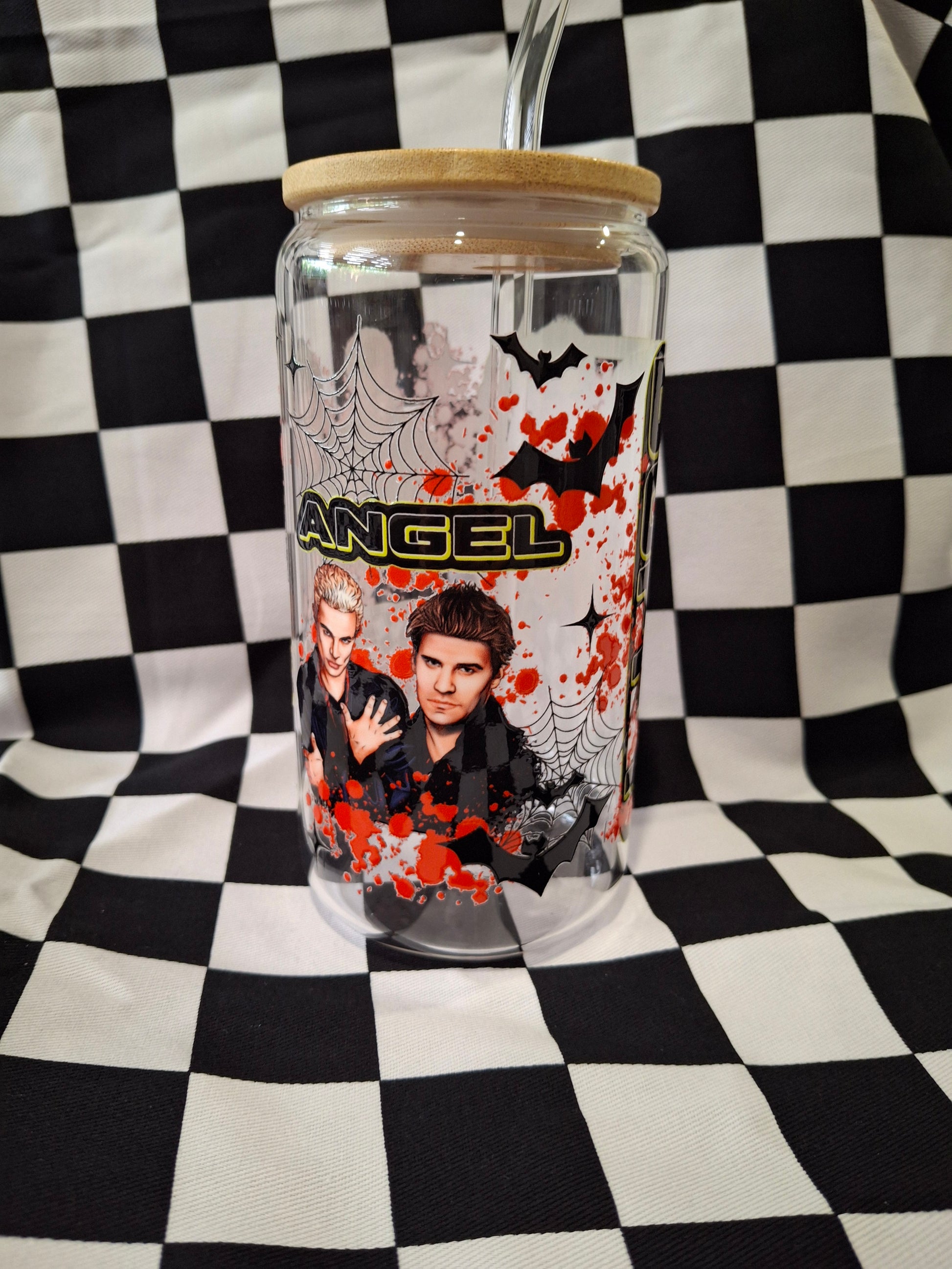 These glass tumblers hold a 16oz capacity. They feature a bamboo lid, glass straw and straw cleaner.
