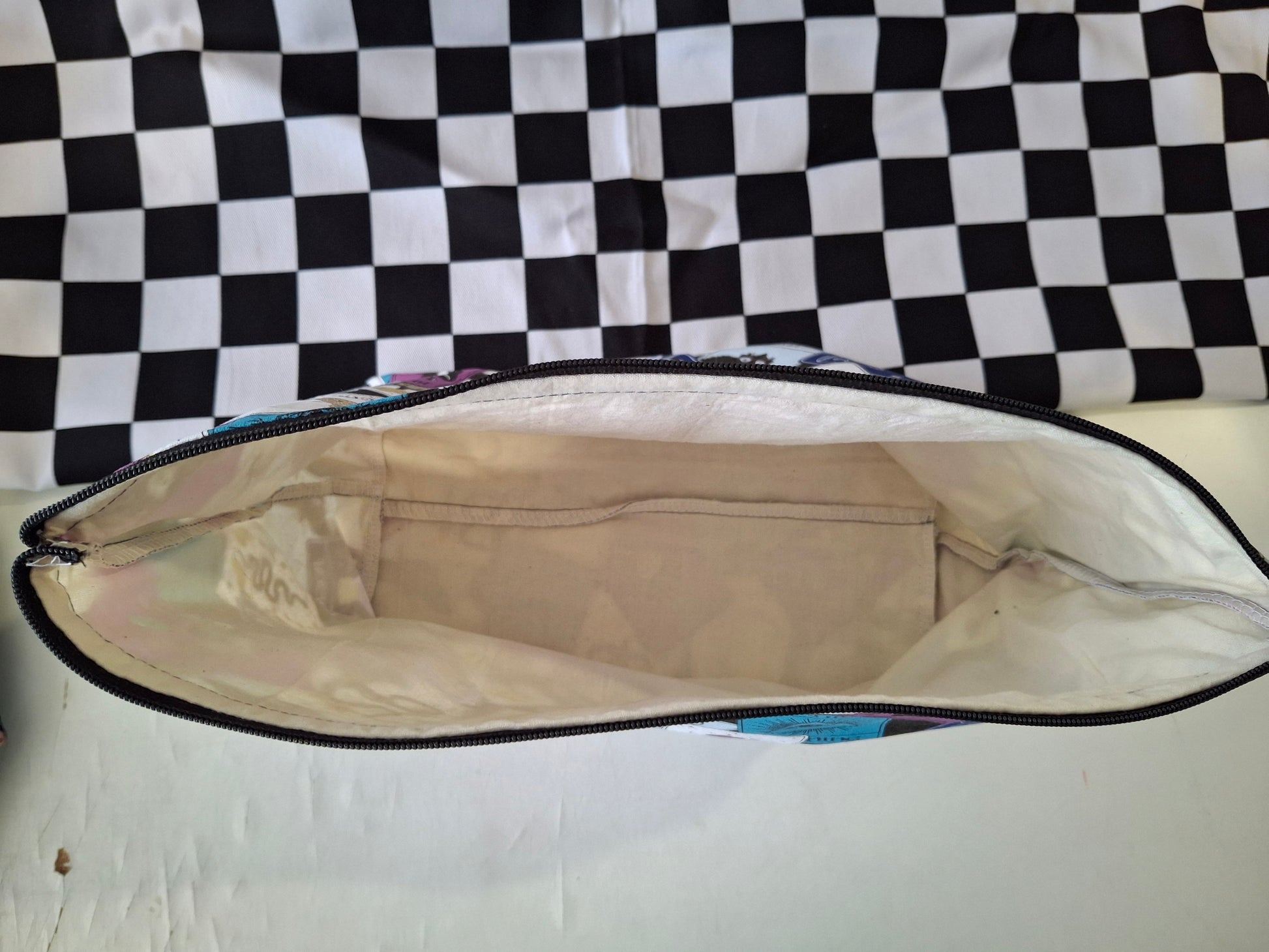 Handmade makeup bag or project bag for craft items. Featuring a square bottom so it will stand up on its own.