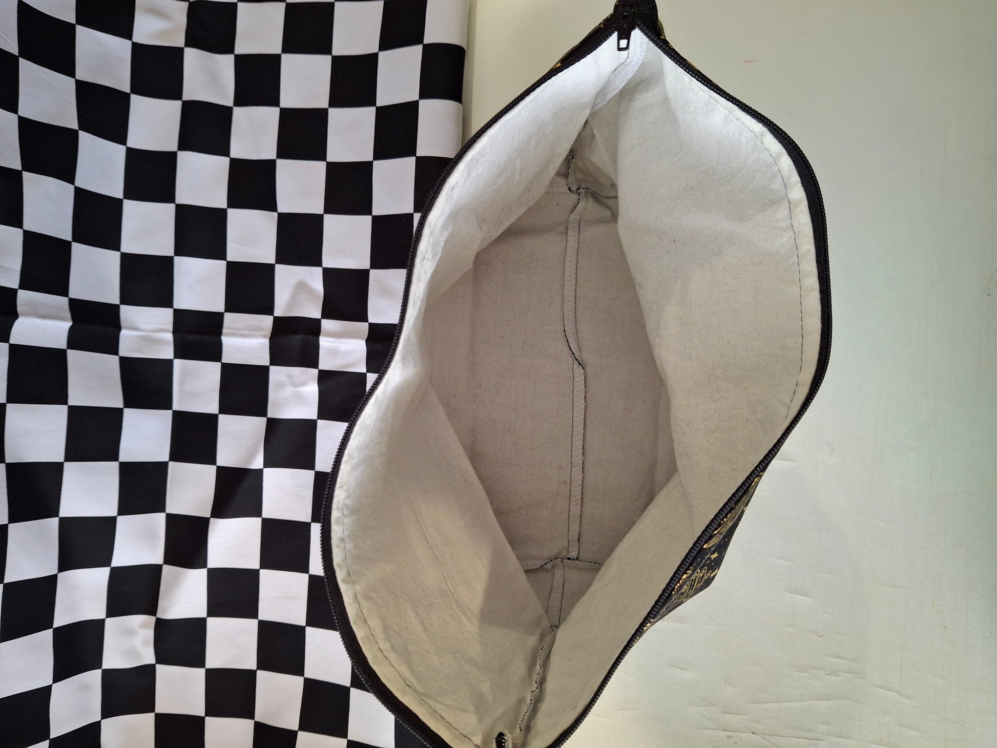 Handmade makeup bag or project bag for craft items. Featuring a square bottom so it will stand up on its own.