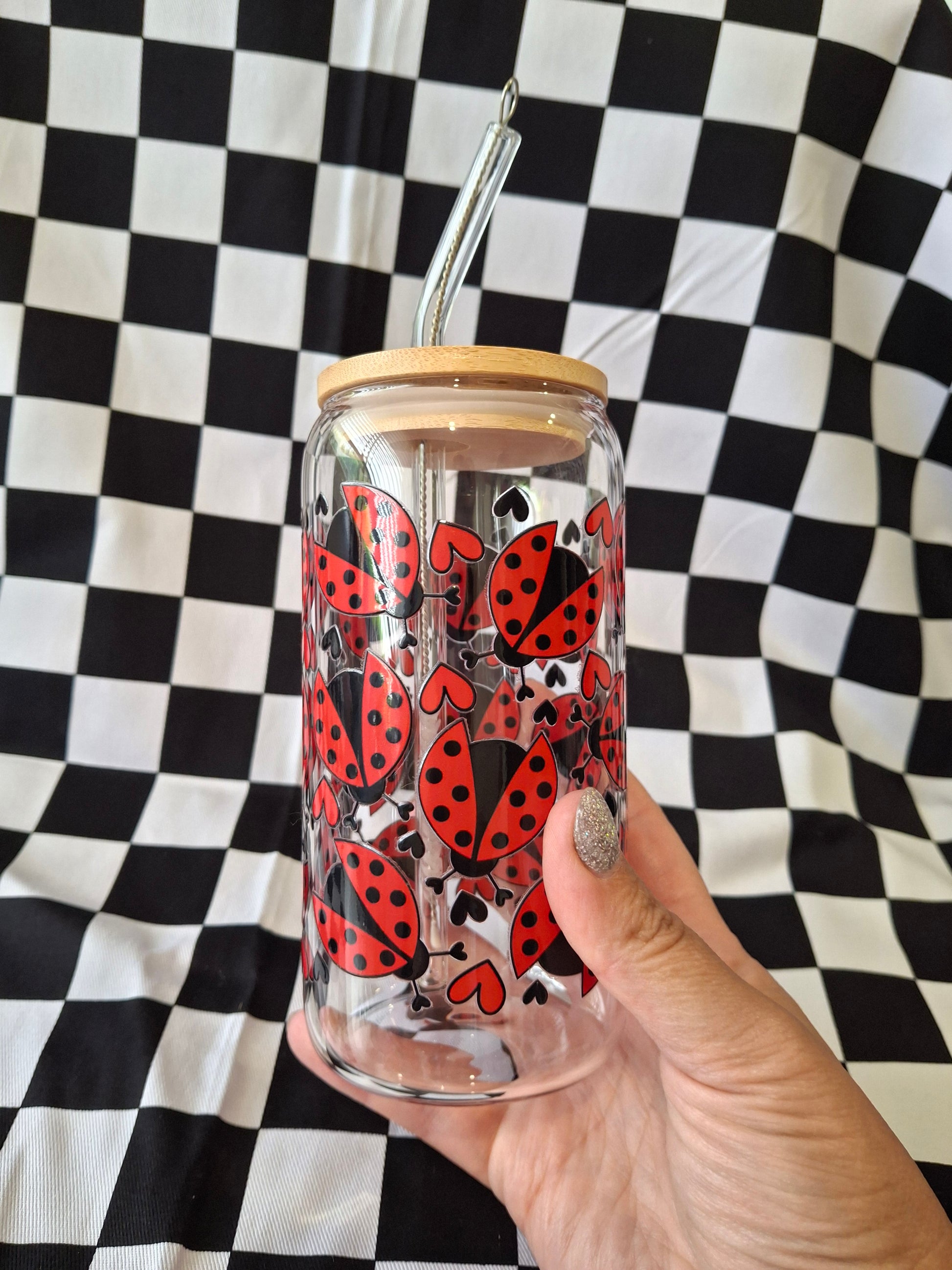 These glass tumblers hold a 16oz capacity. They feature a bamboo lid, glass straw and straw cleaner.